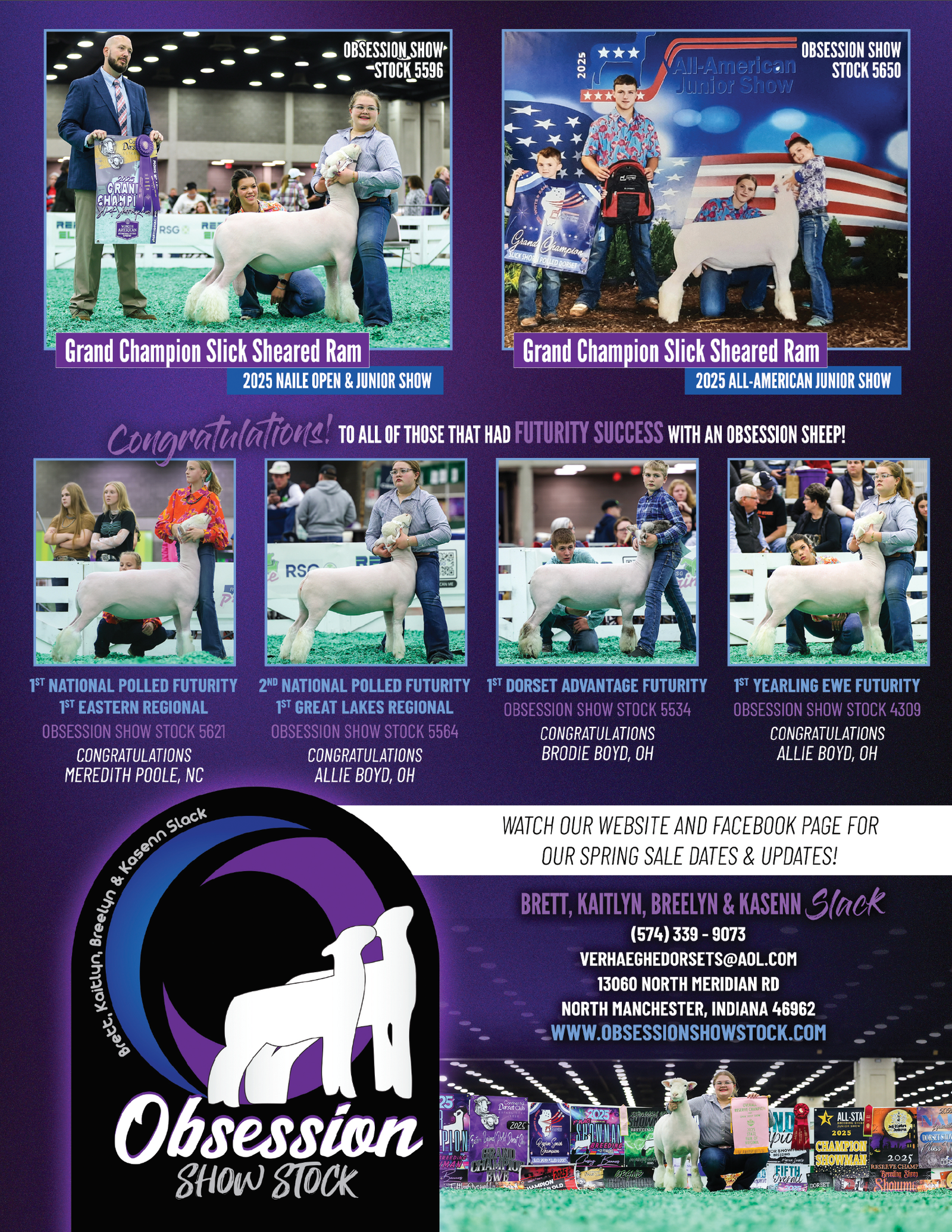 On October 4, 2014, Brett Slack and I were married. We then relocated my ewes to North Manchester, IN so Brett and I could begin our lives together and we made the transition from Verhaeghe Dorsets to Obsession Show Stock.